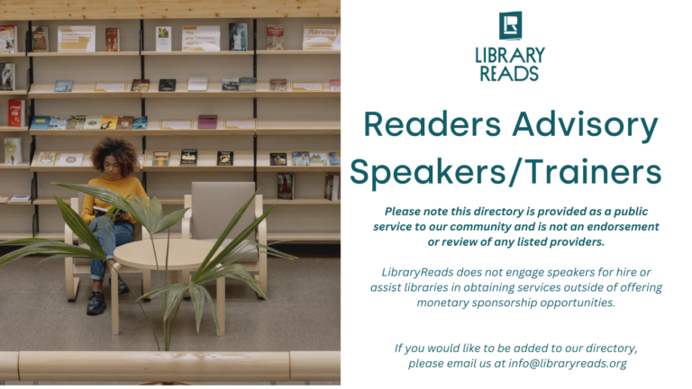 (specialties: Readers Advisory Training, Starting/Maintaining/Refreshing a Book Group, Audiobook Advisory, Staging Successful Author Events, Passive RA promotions)